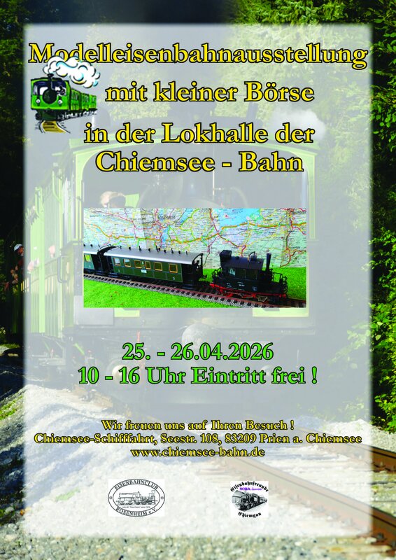 - Ort: Heizhaus der Chiemsee-Bahn, Seestraße 108d, 83209 Prien am Chiemsee (Hafen Stock)